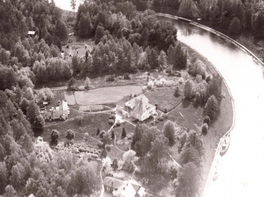 Kuvassa seurakuntakeskuksen tontilla aiemmin sijannut Backmanin huvila. Kuva vuodelta 1927, Ilmavoimien kuvakokoelma/Sotamuseo (Asikkalan kotiseutuyhdistyksen arkistosta)